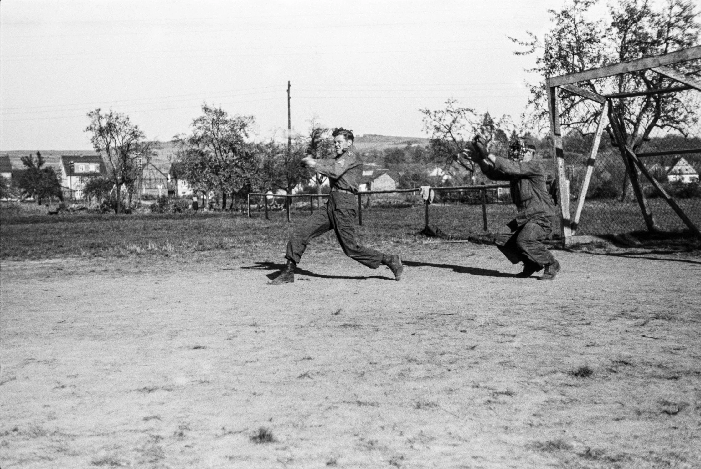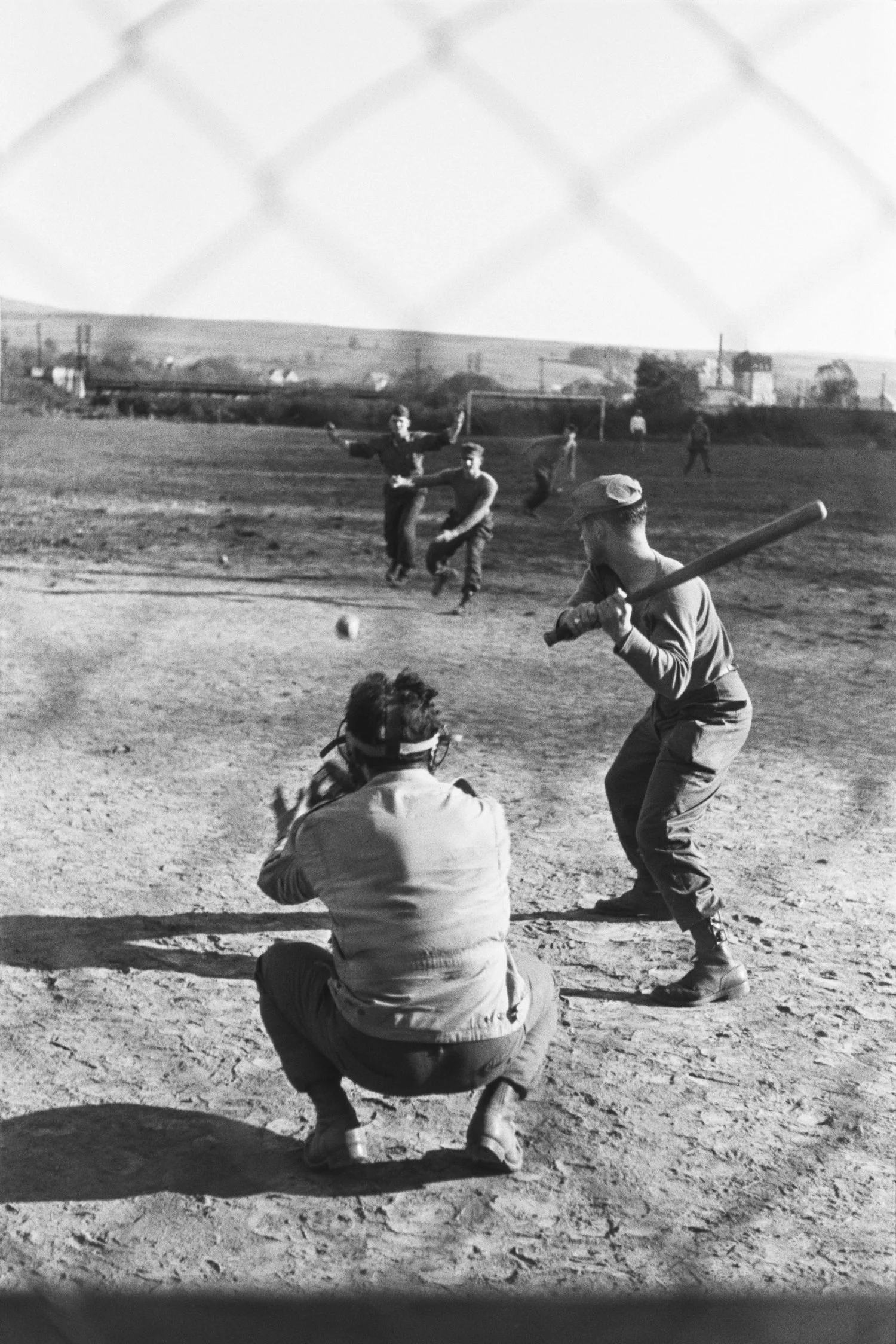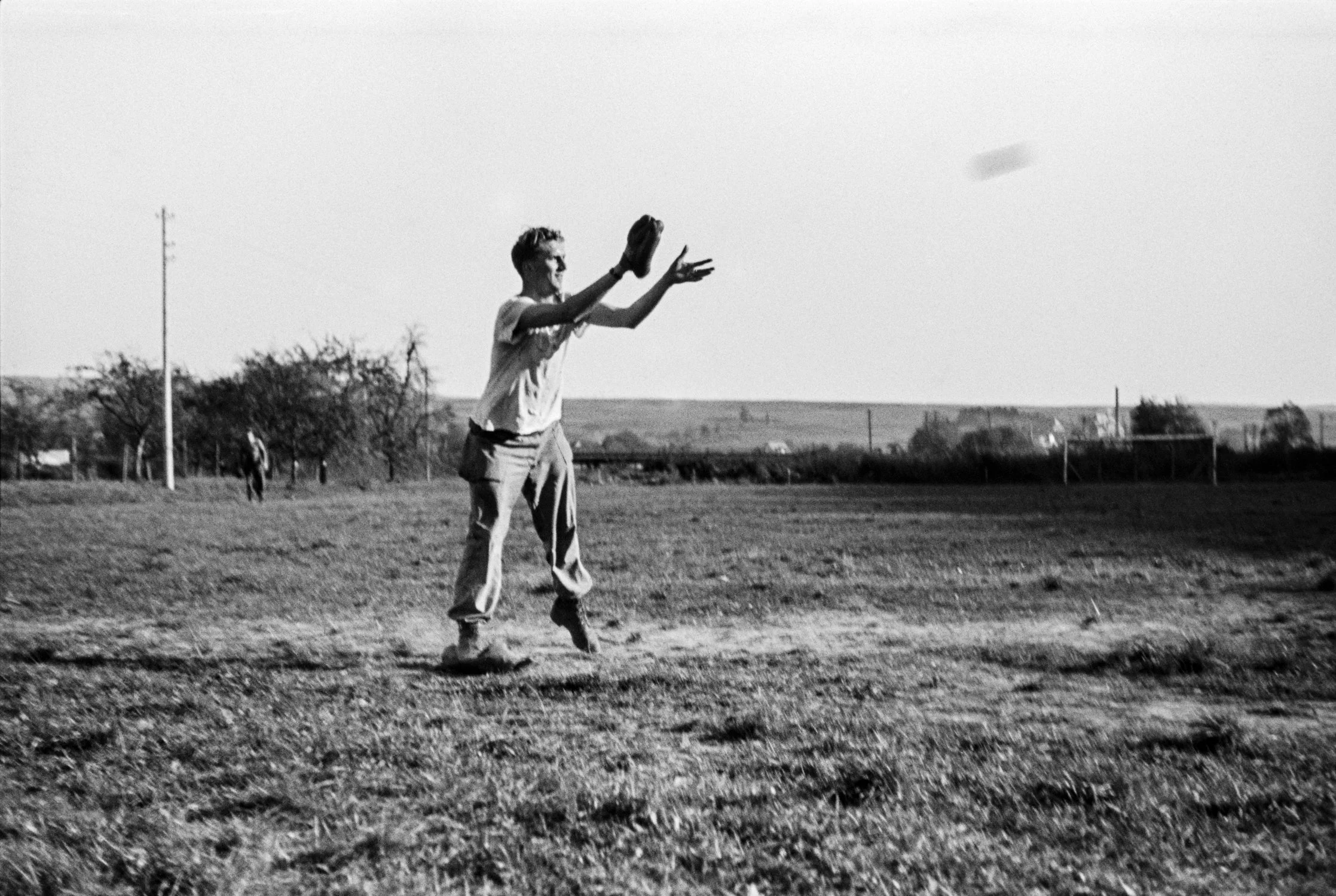 In a series of photographs American GIs play ball next to a farmhouse with laundry hanging on a clothesline and a chicken coop in the outfield. Two young girls stand watching. Men from their village, perhaps their fathers, had gone to war against the Allies, and now American soldiers were playing in their yard.